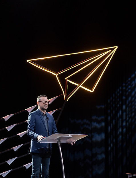 The concept behind this installation we provide for JPCC is hundreds of little paper planes arranged as if they are moving together to "follow" the biggest one made of LED.